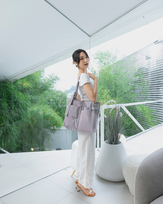 SIGNATURE POCKET DENIM TOTE BAG IN PURPLE DENIM